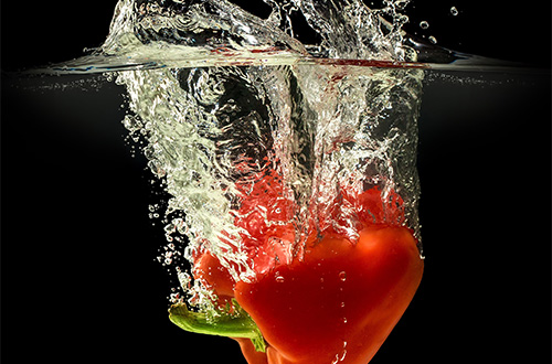 Red bell pepper falling in water with splash on black background